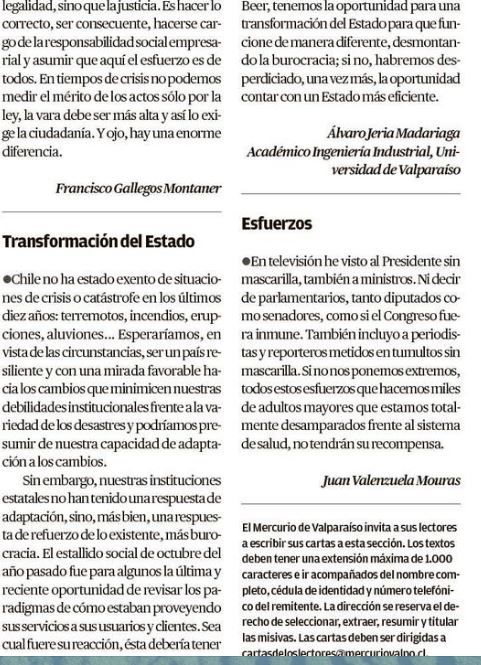 Hoy en el Mercurio de Valparaíso, se publicó una Carta al Director, llamada Trasformación del Estado del Profesor Alvaro Jeria, de nuestra escuela.