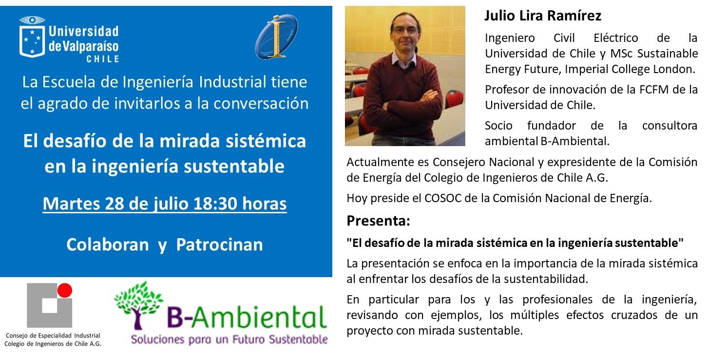 Este martes 28 de julio, se desarrolló el Conversatorio “El desafío de la mirada sistémica en la ingeniería sustentable”, en el cual pudimos contar con el colega Julio Lira Ramírez, Ing. Civil Eléctrico de la Universidad de Chile y Msc Sustainable Energy Future, Imperial College London, Socio y fundador de B-Ambiental.