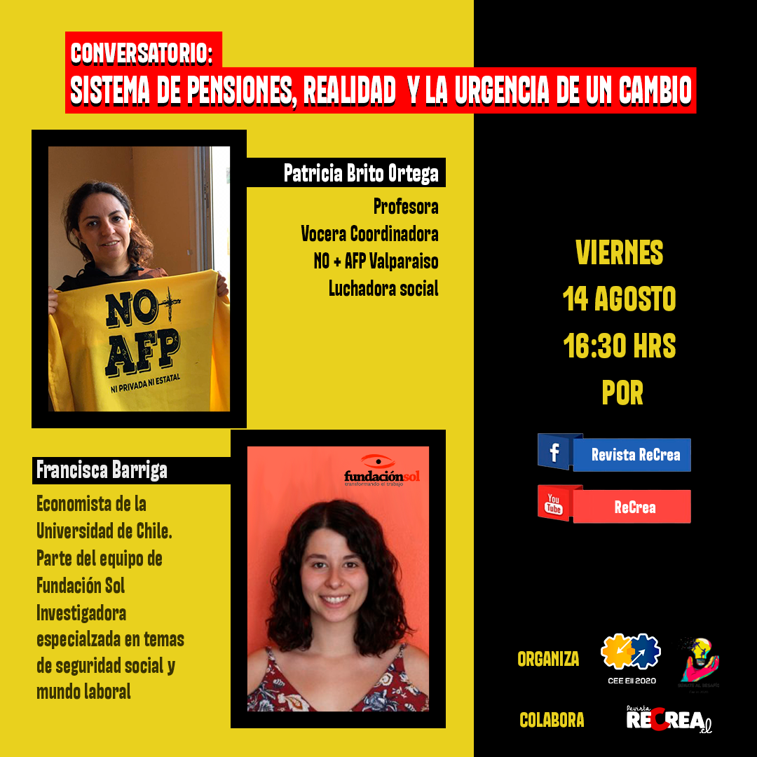 Conversatorio en torno al sistema pensiones donde participó Patricia Brito Ortega de la Coordinadora No Más AFP Valparaíso y Francisca Barriga desde Fundación Sol. Este espacio de genera a través de los departamentos de Extensión y Cultura de los Centros de Estudiantes de Ingeniería Civil Industrial, tanto de Valparaíso como de Santiago con el fin de adentrarnos en esta discusión de gran relevancia para quienes estudiamos Ingeniería Civil Industrial